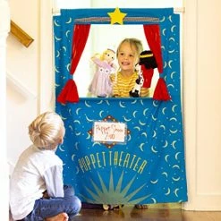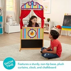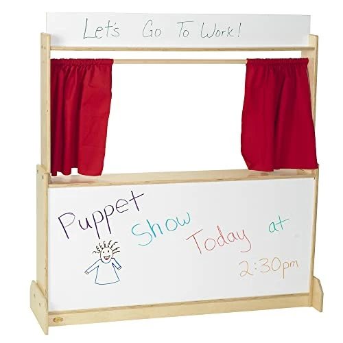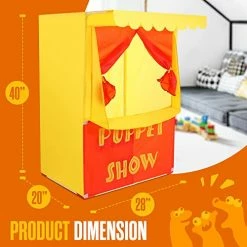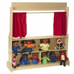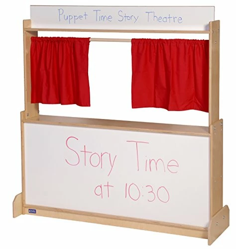 - STORAGE: Pretend play can get messy. Every space needs furniture with storage. This Puppet Show Theatre comes with a sliding curtain and plenty of storage shelves on the back side. Storage areas measure 47″L x 10″H and 23″L x 10″H.