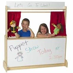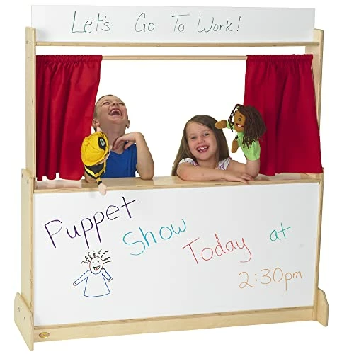 It’s a theatre. It’s a storefront. It’s a drive-up window at a restaurant or bank. Children will discover dozens of ways to use this special unit. Dry-erase marquee and front panels allow kids to customize for each activity. Theatre includes a sliding curtain and plenty of storage shelves in the back. Unit is constructed of durable, 5/8-inch thick, premium ply with a UV finish. Woodgrain back panels are recessed into side and top panels and screwed into place.