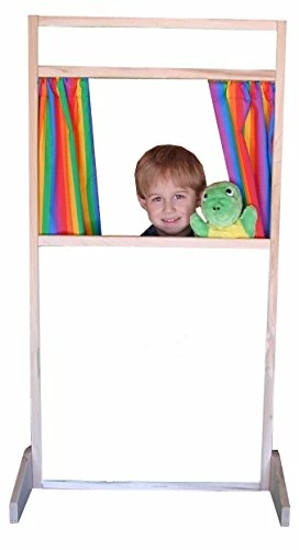 The Beka Store Front Theater is perfect for small spaces. It is a single 23-1/2″ Wide x by 45″ Tall panel. The panel is supported by two large 15″ support feet which are easily attached with a phillips screwdriver. Designed for stability! The theater opening is 21 1/2″ wide by 14 1/2″ high. Available with either green chalkboard (#05001) or white marker board (#05002) art surfaces. Curtains are included (fabric color & pattern may vary). Includes pivoting “buttons” to hold the curtain rod securely in place during use. Some assembly is required. Weight is 11 lbs. Adult Assembly Required. Recommended age: 3+ years