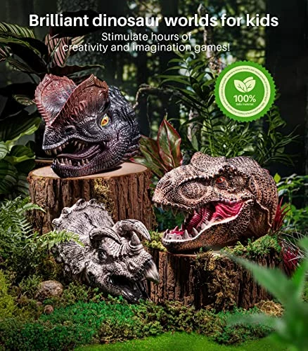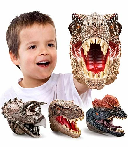 - DIFFERNT DINOSAUR FIGURES: 3-pieces set includes the Tyrannosaurus,Dilophosaurus,Triceratops provide variable imaginary space for your kids. Children can get knowledge of the dinosaurs’ name, species and life habits by using the T-Rex model. Puppets also encourage children to use their imagination actively.