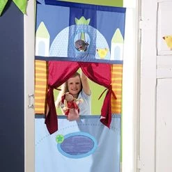 We bought this theater unit to use with our 5 and 2.5 year old grandchildren when they come to visit. We liked the arrangement where the theater can be hung in a doorway, allowing for multiple locations and easy set-up and removal. This has worked very well, and the tension bar at the top is even adjustable to some extent for variable door widths, which as I recall was not emphasized in the product description. The theater is well-made and layout is well designed and colorful, an interesting, almost exotic architectural format. The features with the peak-hole opening at the top and plastic window for a sign at the bottom are great, as well as the tie-back curtains. It really provides a theater experience. We printed a sign with graphics and placed it in the window below, customizing the theater with a name that was meaningful to our grandkids. The only minor drawback was that, given the young age of our grandson and granddaughter, when they put on a show with the theater base just touching the floor the height of the stage was a bit high especially for the 2.5 year old. We addressed this by hanging the stage lower, not a big deal obviously. Our grandkids absolutely love the theater and the puppets, both having grandpa (whose has never done puppetry before) do shows or playing with the puppets themselves. What a great alternative to videos and noisy motorized toys! We are looking forward to many hours of fun with this theater.