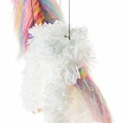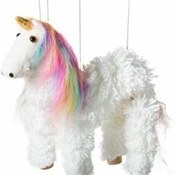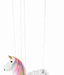 - Soft yarn body with rainbow mane and tail, wooden marionette bar and unicorn hooves